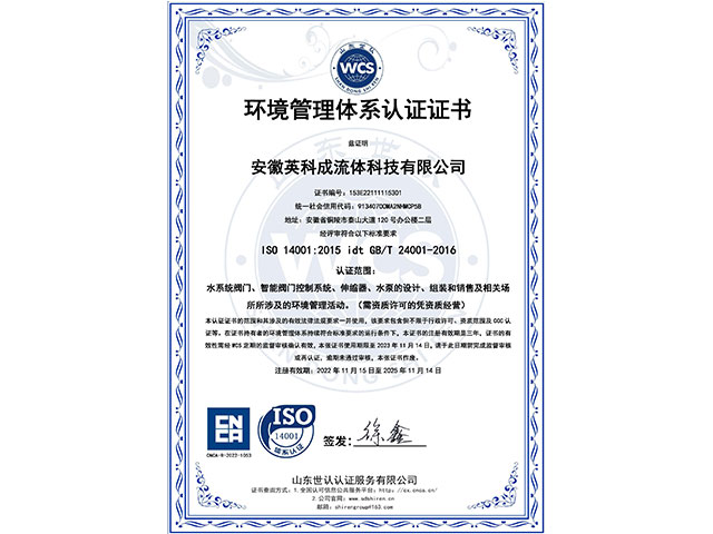 安徽英科成流體科技有限公司位于黃山腳下長江之濱的中國古銅都-安徽省銅陵市。公司注冊資金1.1億,是國內一家專業致力于給排水行業系統解決方案、閥門以及智能閥門技術研發(fā)與生產銷售服務為一體的企業。   我們擁有完善的質量控制體系和檢測設備,公司主要的產品有閘閥、蝶閥、偏心半球閥、液控蝶式止回閥、靜音止回閥、橡膠瓣止回閥、活塞式流量調節(jié)、錐型閥、節(jié)能型泵控閥、倒流防止器、減壓閥、排氣閥、排泥閥、伸縮器、閘門、啟閉機等二十多個系列,可以充分滿足客戶的一站式需求。……